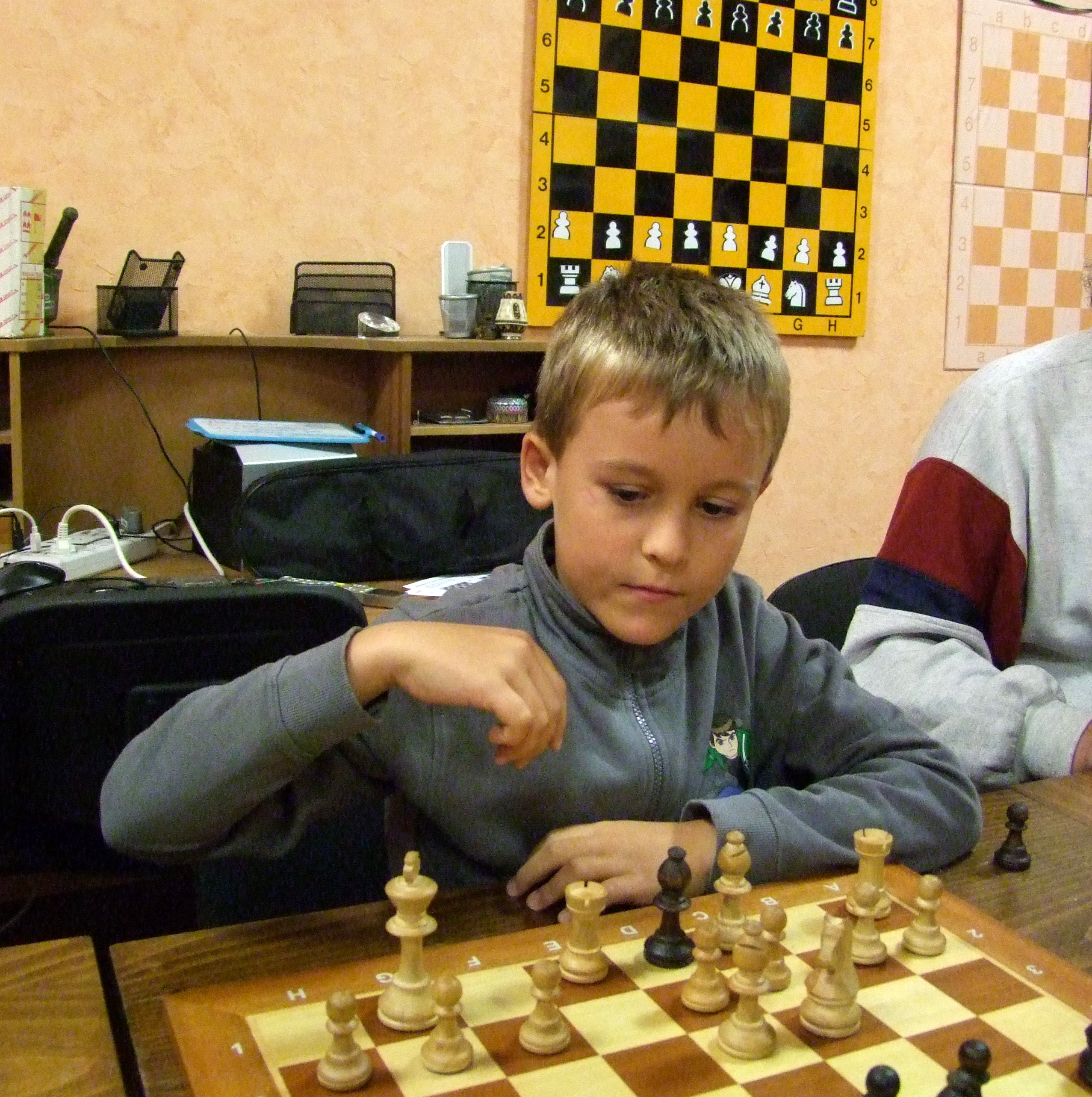 C’était le baptême du feu pour Konogan (rebaptisé « Cardigan » par le président, à la recherche désespérée d’un moyen mnémotechnique de mémorisation du prénom… Ah, celui-là…), qui s’est mis aux échecs voici quelques semaines. Champion de Savoie de Karaté chez les poussins, Konogan sait souffrir, et ne s’affranchit jamais de son demi-sourire. C’est qu’il aime bien les échecs, découvert au hasard d’une collection qui a débuté cet été en librairie et qui a fait l’objet de pub à la télé. Quand il a enfin enregistré sa première victoire face à Antoine, qui, lui, a commencé la semaine dernière, il a sauté de joie! On a planqué les échiquiers en bois de peur qu’il nous fasse une démonstration.
