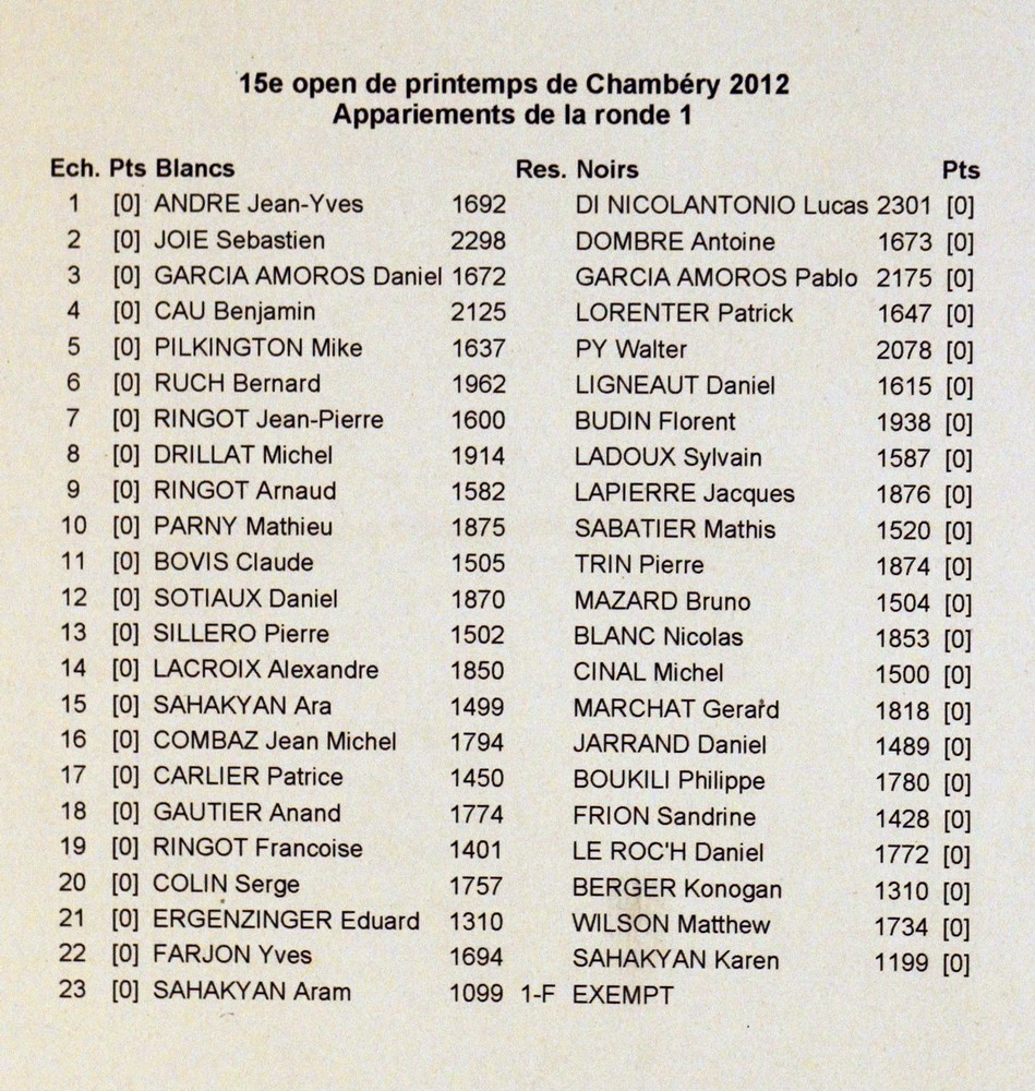 Appariements de la première ronde, qui donne une meilleure idée de la hiérarchie dans ce tournoi :