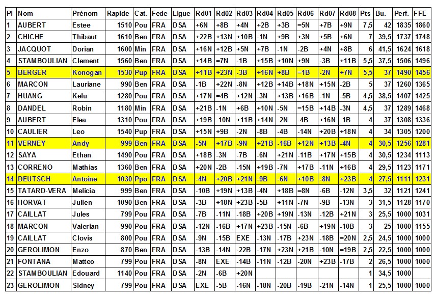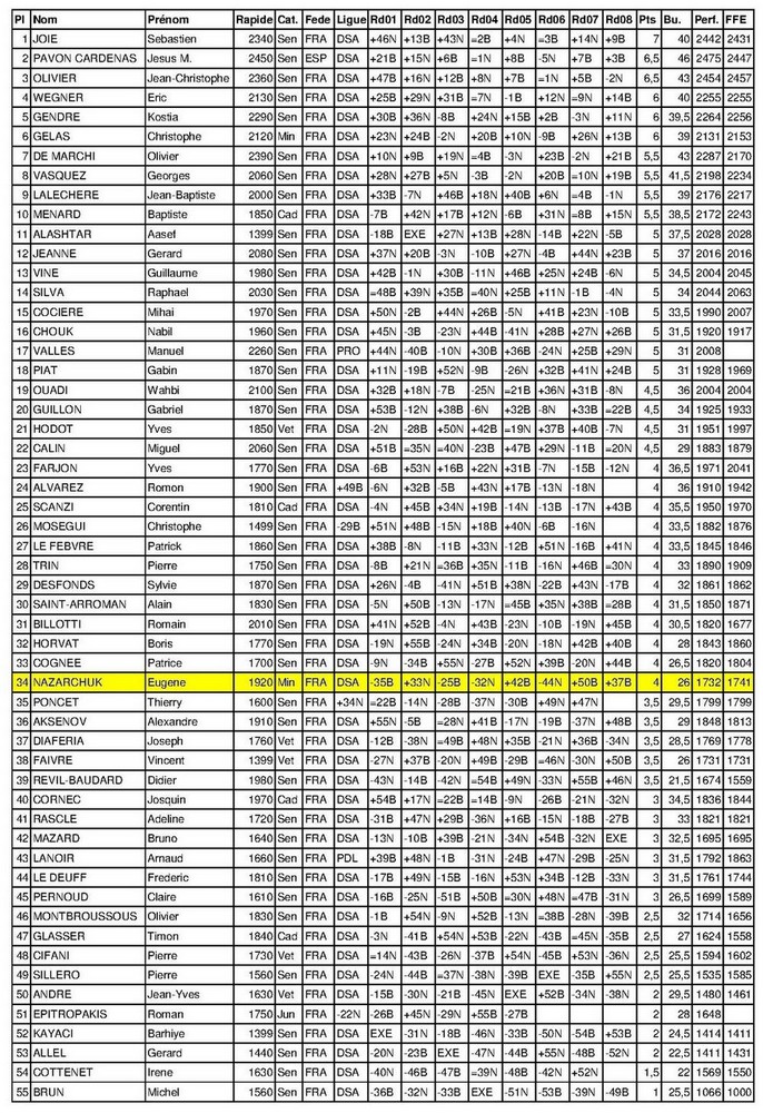 – Andy termine à la 11ème place avec 4 points sur 8 et une performance FFE de 1281. Il obtient notamment 2 belles victoires aux 6ème et 7ème ronde contre des adversaires avec des ELO rapides de 1490 et 1360.