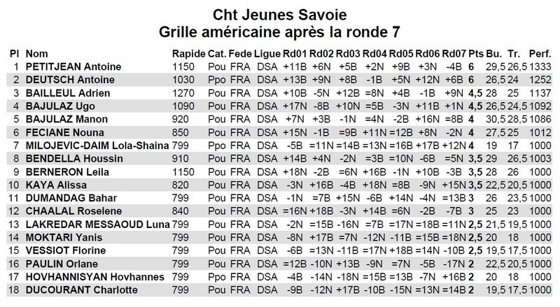Chez les petits poussins / poussins, la première place revient à Antoine Petitjean (avec 6 points sur 7) devant Antoine Deutsch (avec également 6 points).