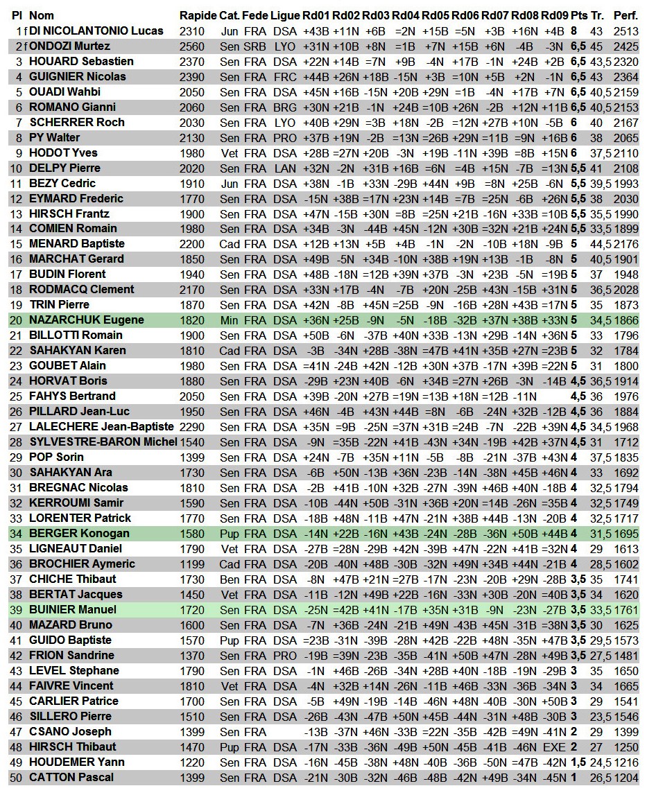 Le tournoi est remporté par le grenoblois Lucas Di Nicolantonio (2310) avec 8 points sur 9 devant le bressan Murtez Ondozi (2560) avec 6,5 points et l’annécien Sébastien Houard (2370) avec 6,5 points.