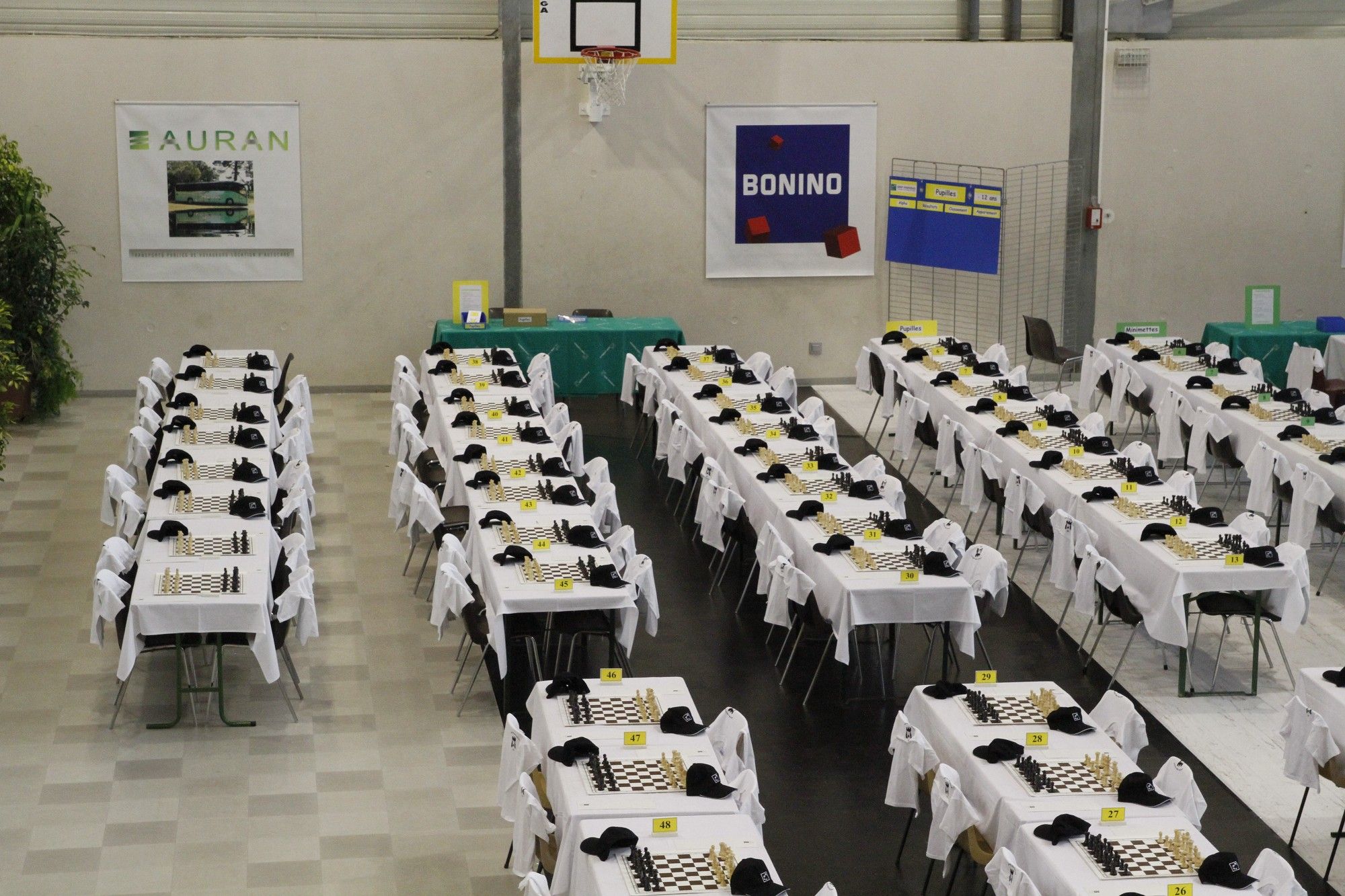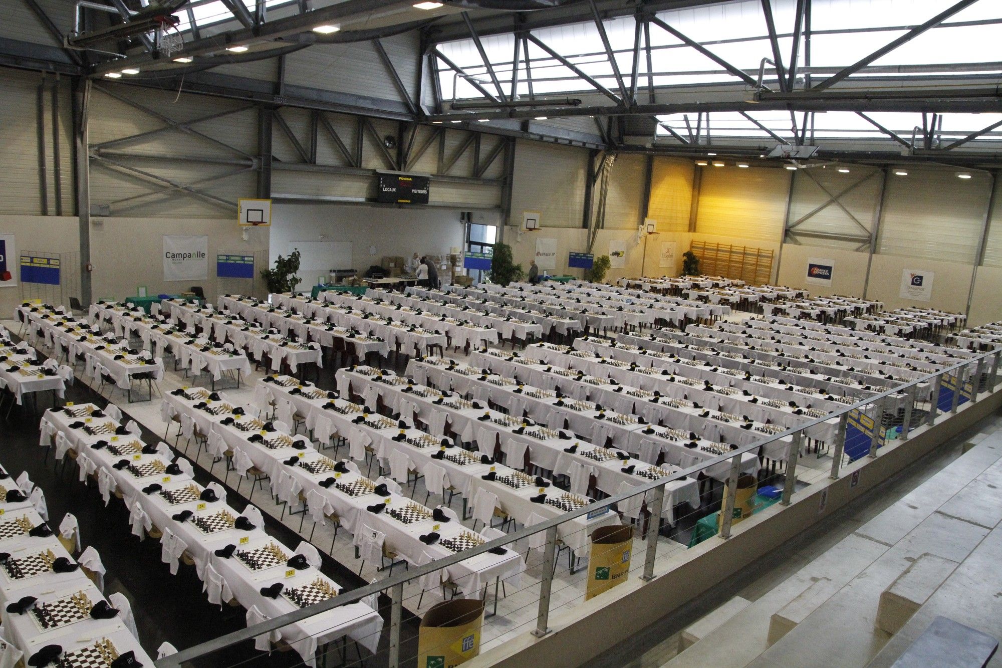Plutôt impressionnant avec (d’après un rapide calcul) ses 298 tables (dont 50 avec un échiquier tactile pour le suivi des parties en direct) et 596 chaises sur lesquelles se trouvent la casquette et le T-shirt offert à chaque participant.