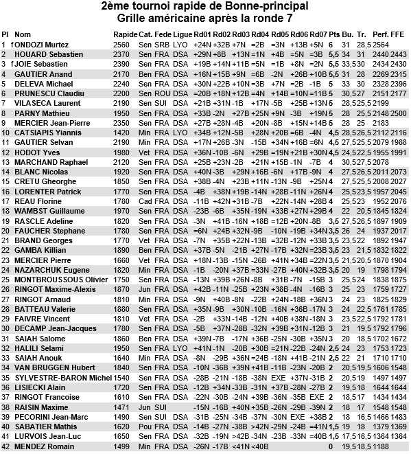 Un peu plus loin, on retrouve Antoine D. à la 9ème place avec 4,5 points (soit à 1/2 de la troisième place) et une perf FFE de 1172.