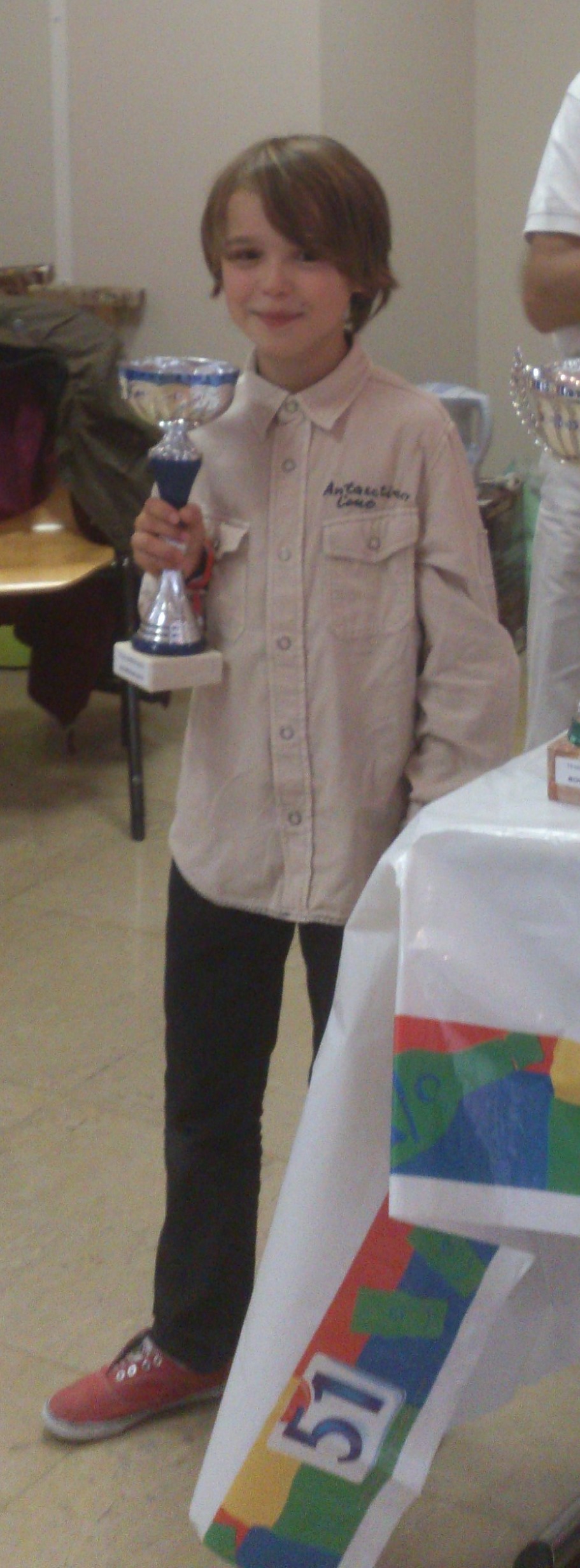 La quatrième ronde débute à 9h30 : rien n’effraie nos petits joueurs d’échecs valeureux ! Et la matinée commence avec un duel entre notre Manon et la collégienne Mathilde, deux joueuses du club. Le combat est féroce et la concentration bat son plein. Mathilde a une tour en moins mais elle compense avec plusieurs pions bien avancés. Mathilde reprend la situation et marque son premier point. C’est au tour d’Ugo d’être exempt et de marquer un point. Antoine Deutsch se retrouve confronté à Pierrick Four (1765 élos) mais il n’arrive pas à concrétiser pour son deuxième point. Sébastien, monsieur 100% jusqu’à présent, perd sa première partie contre un des favoris du tournoi, Tristan Debray (2139). Virginie remporte sa quatrième partie contre Samuel Lavault qui se voit contraint d’abandonner. Revenons aux deux énergumènes liés par le sang, Lola et Nicolas car en dehors des parties, ça court ! Et c’est au tour de Lola d’affronter Claire Pernoud, cette dernière remportant la partie. Nicolas joue Samuel Bois et .Eugène rencontre Jacques Bruneau (1550 élos). Il marque son troisième point sans grandes difficultés. Antoine arrive dans une position égale en finale face à Daniel Chabert (1510 élos) et fait match nul. Mathilde, sa sœur, remporte le gain face à Manon.