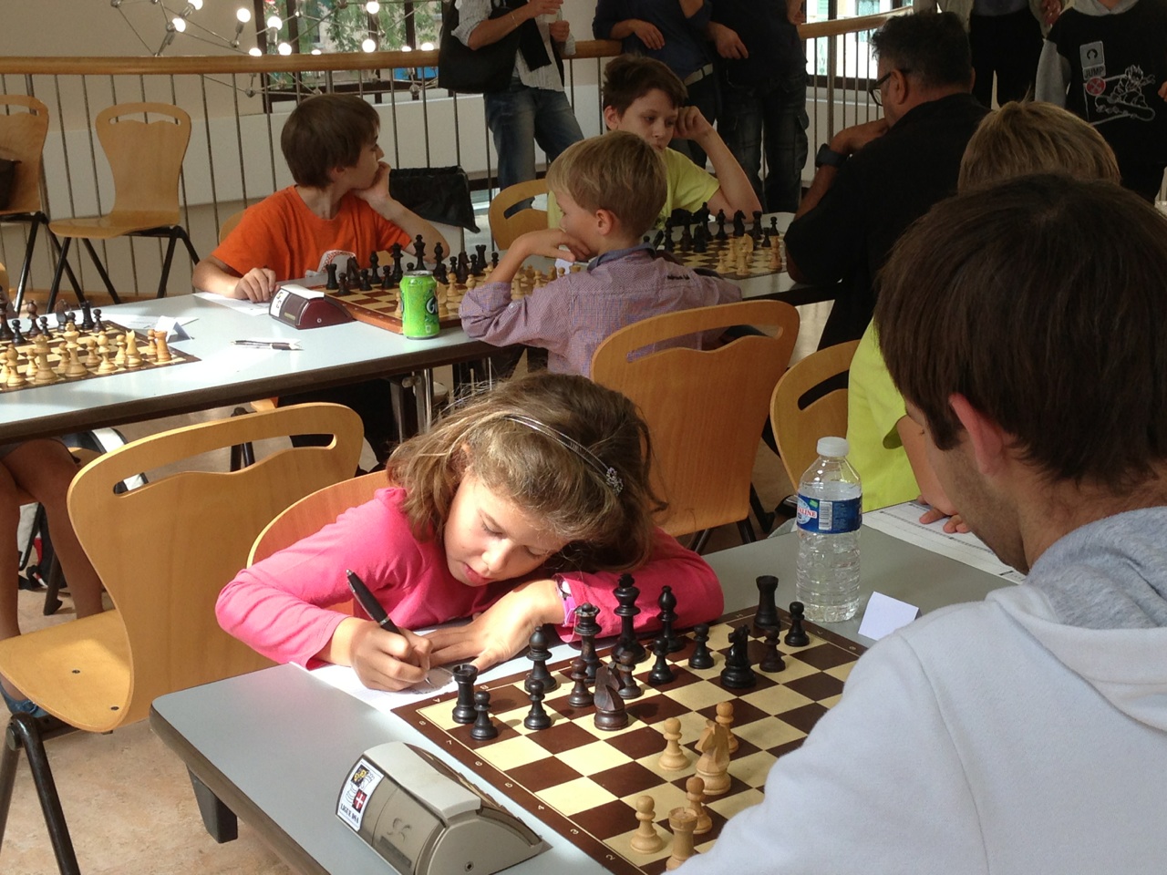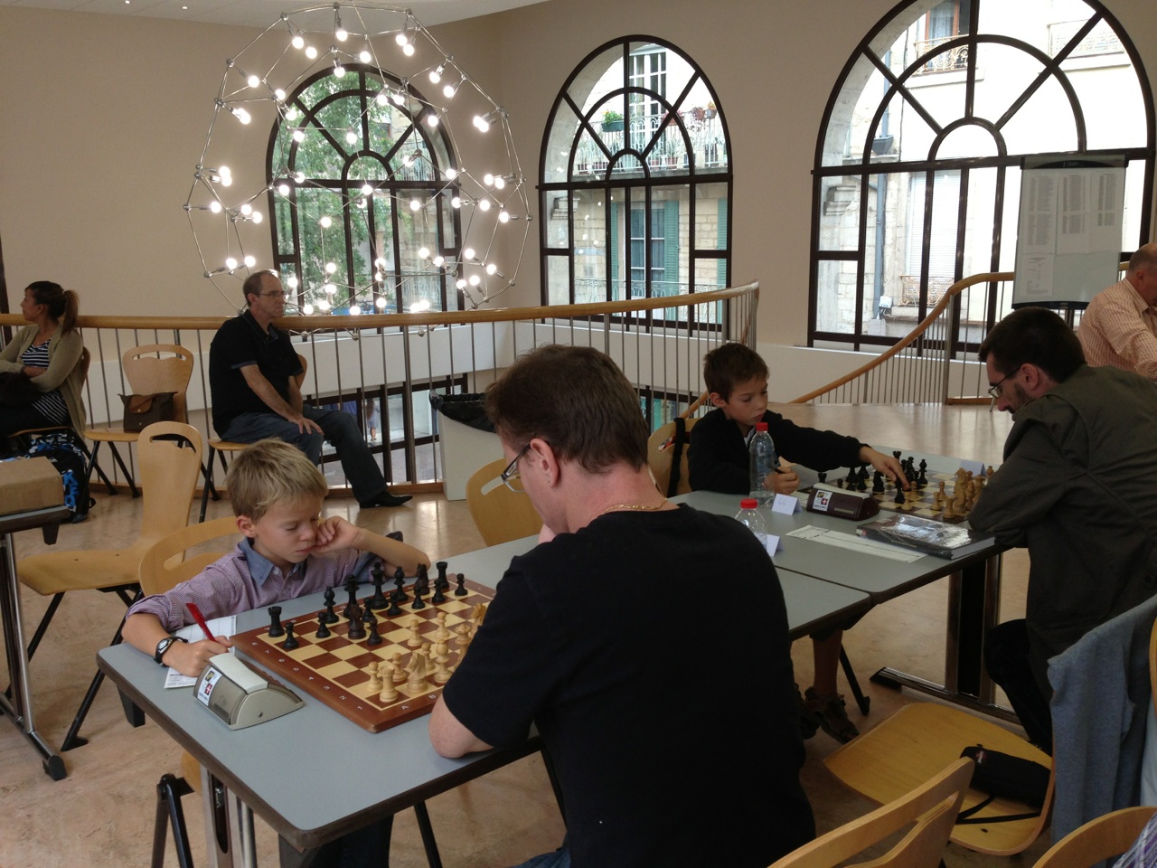 La première ronde débute à 10h. L’agitation et les bavardages laissent place au silence et à la concentration. Manon joue Pierre Salinas, 1482 élos. Son adversaire, de plus de 250 élos par rapport à elle, remporte la partie. Son frère Ugo s’incline également contre Thomas Laronche, son classement étant supérieur de 400 élos. Passons à la famille Milojevic-Daim où les deux représentants de la nombreuse tribu, Lola et Nicolas, jouent respectivement contre Thomas Lepoittevin, 1444 élos (le 4, chiffre du diable…mais en Chine) et Bernard Mas, 1477 élos. Tous les deux perdent leur partie.