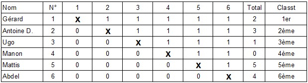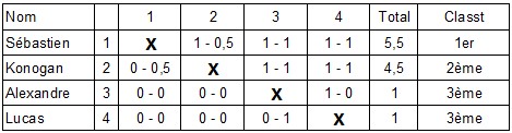 Pour la troisième place, Alexandre et Lucas ne peuvent se départager (1 victoire chacun).