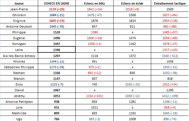 Pour ce septième rendez-vous autour d’un nouveau tableau, ô combien coloré, il y a eu du mouvement et ces résultats confirment la cogitation de neurones dans certains cerveaux ! A commencer par notre Jean-Pierre, qui une fois de plus, explose les compteurs en atteignant 2119 élos dans la catégorie « échecs en ligne ». Mais il ne s’arrête pas là, notre « président », car il monte également les deux autres scores de jeu « pur ». Maintenant, nous savons ce qu’il fait de ses nuits. Les blitz en une minute, c’est son cheval, pardon, son Cavalier de Bataille et ça ne le rend pas Fou ! Aimant tellement son score en tactique, il n’ose plus y toucher !