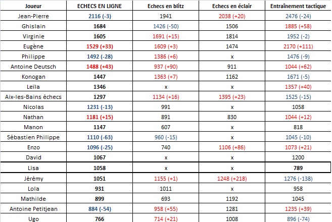 Eugène reprend sa quatrième place et tandis qu’il dévore sa médaille en chocolat, nous pouvons le féliciter pour son beau score en tactique, 2170 élos, à 300 points de notre Président ! Quant à ce dernier, il nous montre qu’il est autant passionné par l’étude de ce jeu que par sa pratique elle-même. Acharné comme un fou, il arrive, en 1-1 (en français, cela signifie que c’est une partie où les deux adversaires n’ont qu’une minute de réflexion chacun pour mater l’adversaire), à augmenter son score !