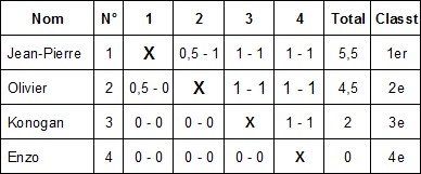 En raison du petit nombre de participants (nous sommes en plein milieu des vacances de Toussaint), un seul tournoi de blitz a eu lieu ce samedi avec 4 participants : Enzo, Konogan, Olivier et naturellement Jean-Pierre.