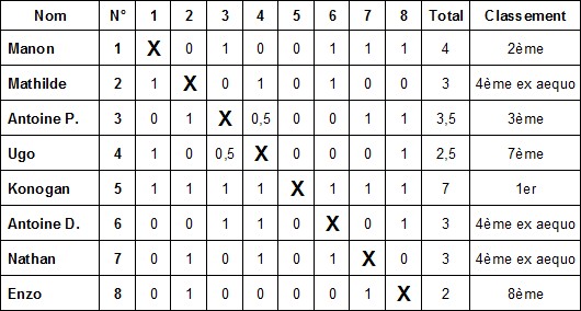 Si on ajoute que Ugo et Enzo terminent respectivement 7ème avec 2,5 points et 8ème avec 2 points, on s’aperçoit que 2 points séparent Manon (2ème) d’Enzo (8ème).