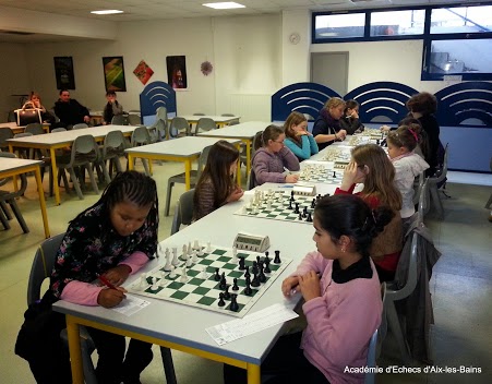 Ce dimanche 03 novembre 2013 s’est déroulée la Nationale 2 Féminine dans les locaux du collège Lamartine, à Aix-les-Bains. Pour cette compétition, trois équipes ont été engagées : une pour représenter Chambéry, une pour le club de Grenoble Bayard et la dernière pour Aix-les-Bains. Pour l’équipe aixoise, les quatre représentantes étaient : Virginie Ludwiczak, Mathilde Petitjean, Manon Bajulaz et Lola Milojevic-Daim. La moyenne d’âge des joueuses était très jeune : environ 10 ans et seulement deux voire trois joueuses sur les douze dépassaient les 14-15 ans ! C’est très prometteur pour l’avenir échiquéen féminin. Exceptionnellement, étant donné un nombre d’équipes impair, deux parties ont été jouées, mais les combats ont été féroces et aucune fille n’a lâché le morceau !