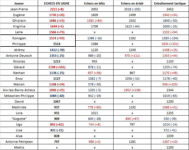 Tout d’abord, notons la montée du petit Berger, alias Konogan, qui est à égalité avec notre vétérinaire adoré vouant un culte pour le massacre de cuillères en plein match de compétition ! Notre collégien talonne Leïla, la fille de Ghislain, notre brave Auvergnat qui, quant à lui, maintient sa troisième place, au désarroi de Virginie qui essaie de récupérer cette médaille de bronze ! Notre nouveau champion de Savoie 2013, Eugène, occupe toujours la seconde place du podium et ne cesse de progresser.