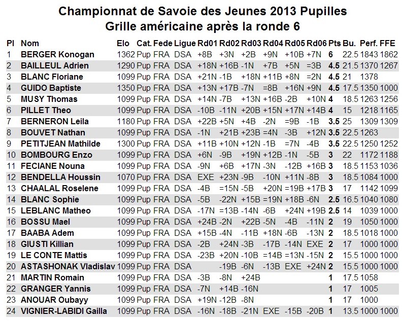 Konogan remporte le tournoi avec 6 points sur 6 devant les Chambériens Adrien Bailleul (4,5 points), Floriane Blanc (4,5 points – première fille) et Baptiste Guido (4,5 points – troisième garçon).