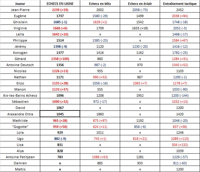Gérard, le seul et l’unique, remonte le classement avec une belle progression en « échecs en ligne » tandis que Konogan s’accroche pour garder sa place ! Chez les jeunes, il n’y a que des progressions : Nicolas et Enzo chez les garçons pour Mathilde, Manon et Margot (alias « gogotte ») chez les filles ! De toute façon, ce n’est pas la quantité qui compte mais la qualité ! Mathilde connait également une belle remontée pour son score en « échecs en blitz ».