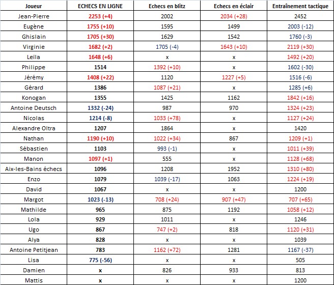 Beaucoup de progressions sont à observer en ce qui concerne la tacticité. Nos jeunes joueurs commencent à afficher de jolis scores. A noter les bonds de Margot et Manon avec une augmentation en « entraînement tactique » de 80 et 68 points élo respectivement. Autrement dit, les filles assurent elles aussi malgré la très forte présence de testostérones !