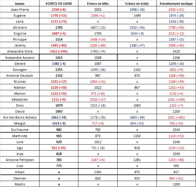 Il y a eu des rebondissements dans le podium. La première et seconde place sont toujours occupées respectivement par Jean-Pierre et Eugène qui prennent le large. A noter que notre Jean-Pierre connait une petite baisse en « échecs en éclair » mais que voulez-vous, déguster des papillotes et jouer aux échecs, cela ne va pas toujours ensemble ! Néanmoins, Jean-Pierre dépasse les 2500 élos en tacticité : un joli record ! Ghislain n’occupe plus la troisième, prise par sa fille Leïla qui nous fait une belle progression.