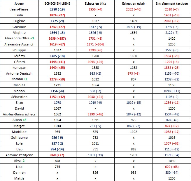 *Roulements de tambour* : le temps passe vite et voilà la 20ème édition du classement chess.com ; autrement dit cela fait déjà 20 semaines que nos jeunes poussent du bois virtuellement ! Et c’est aujourd’hui qu’apparait un nouveau chiffre, en vert, à côté de certains joueurs. Ce n’est autre que les bonds en avant ou en arrière de nos jeunes talents, pour encore plus de réalisme. Et nous ne pouvons que féliciter Alban qui fait +8 places dans le classement !
