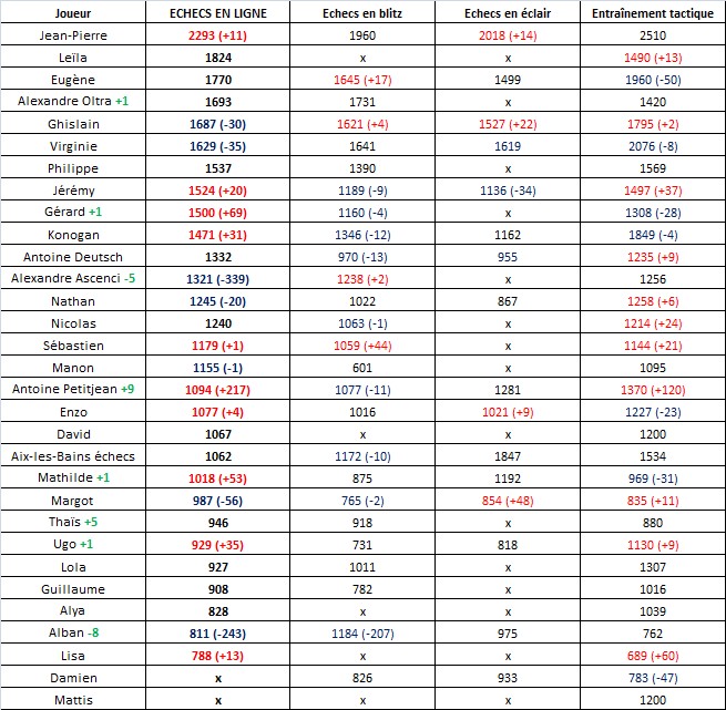 Notre Gégé, qui atteint enfin la barre des 1 500 points élo, monte d’une place dans le classement. La plus belle montée, c’est celle de notre petit Antoine Petitjean. Neuf ans et un saut de neuf places dans le classement : pas de coïncidences possibles ! Au passage, ce jeune garçon augmente son score en « échecs en ligne » de plus de 200 points et plus de 100 points en tacticité : ça y est, les compteurs se débloquent ! Et quant à sa grande sœur, Mathilde, elle aussi, se fait remarquer avec +53 points en « échecs en ligne ». Notre jeune Thaïs fait également un joli bond de cinq places dans le classement. Malheureusement, Alban connait une chute de huit places mais ce n’est pas cela qui le découragera à remonter !