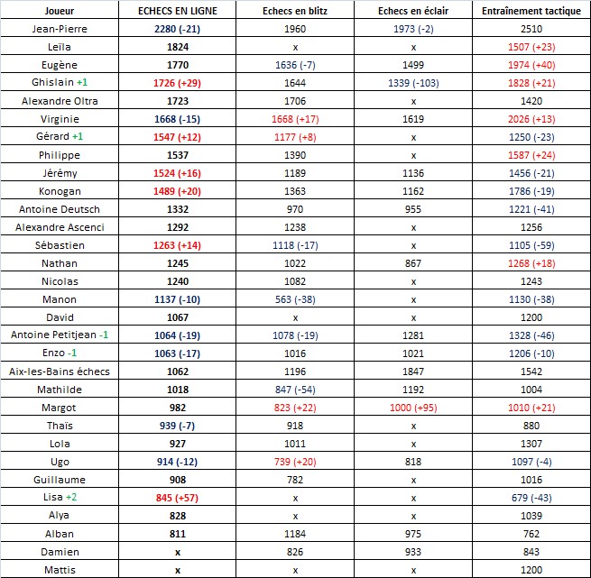 Le trio de tête, c’est toujours le même ! Mais notre Président connait une petite baisse de régime, perdant alors quelques points élo sur deux de ses quatre classements. Quant à Leïla et Eugène, ils progressent en tacticité. Ghislain prend la quatrième place à Alexandre, les deux hommes restant au coude à coude.