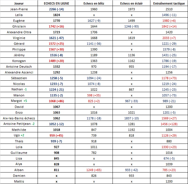 Félicitations à Margot qui fait un bond de cinq places dans le classement. Les filles font la loi ! En plus, elle augmente deux de ses classements. Également, notre petit Ugo fait preuve de progrès en « échecs en ligne » et « entraînement tactique ». Et ses efforts sont récompensés par un saut de deux places dans le classement. Petite ligne pour notre petit Antoine Petitjean qui, malgré une légère chute dans le classement, affiche +158 points en tacticité. Fin calculateur le petit bonhomme !
