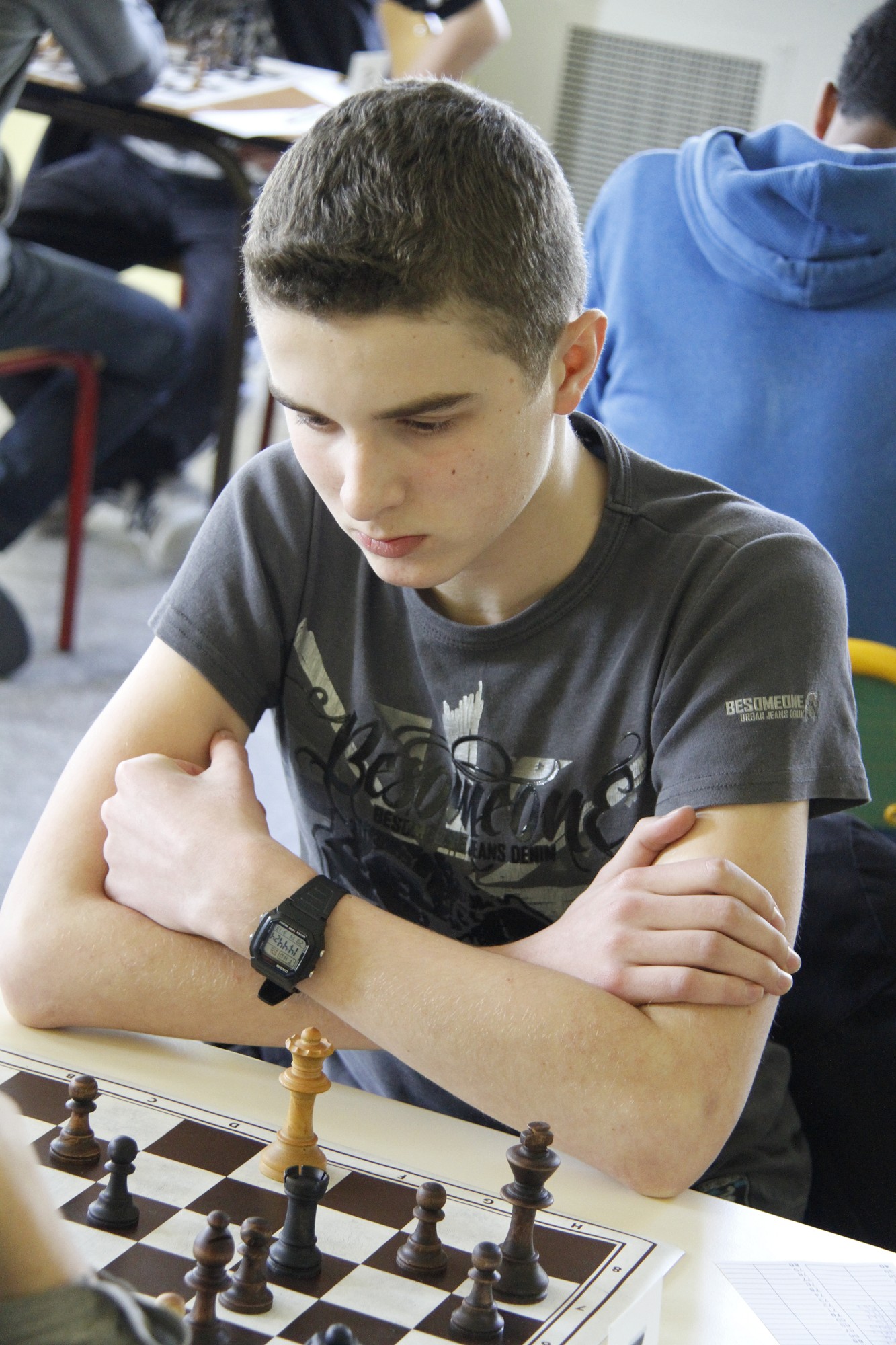 Ronde 1 : Alexandre (1440 N) est opposé au Romanais Mathis Fay (1199 E). Il remporte une victoire logique au terme d’une partie sérieuse et bien maîtrisée.