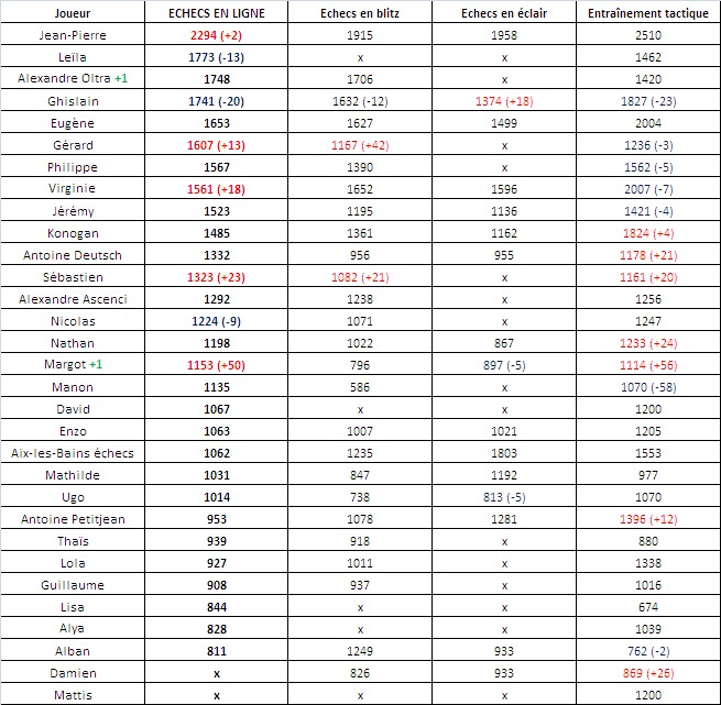 Mais l’expérience joue beaucoup. Notre vétéran préféré et dévoué pour le club, Gérard, dépasse la barre des 1600 élos et s’attaque aux premiers. Soulignons également les progrès de son acolyte, Sébastien Philippe avec + 23 points élo en échecs en ligne. C’est d’ailleurs lui le joueur de la semaine avec une augmentation significative de trois de ces scores.