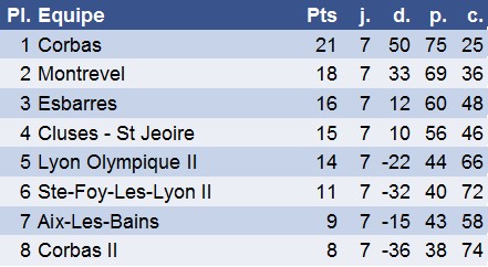 – 1 victoire contre Lyon Olympique et 1 défaite contre Ste Foy : on reste en N3 si Ste Foy perd contre Cluses et si Corbas 2 ne gagne pas ses 2 rencontres ;