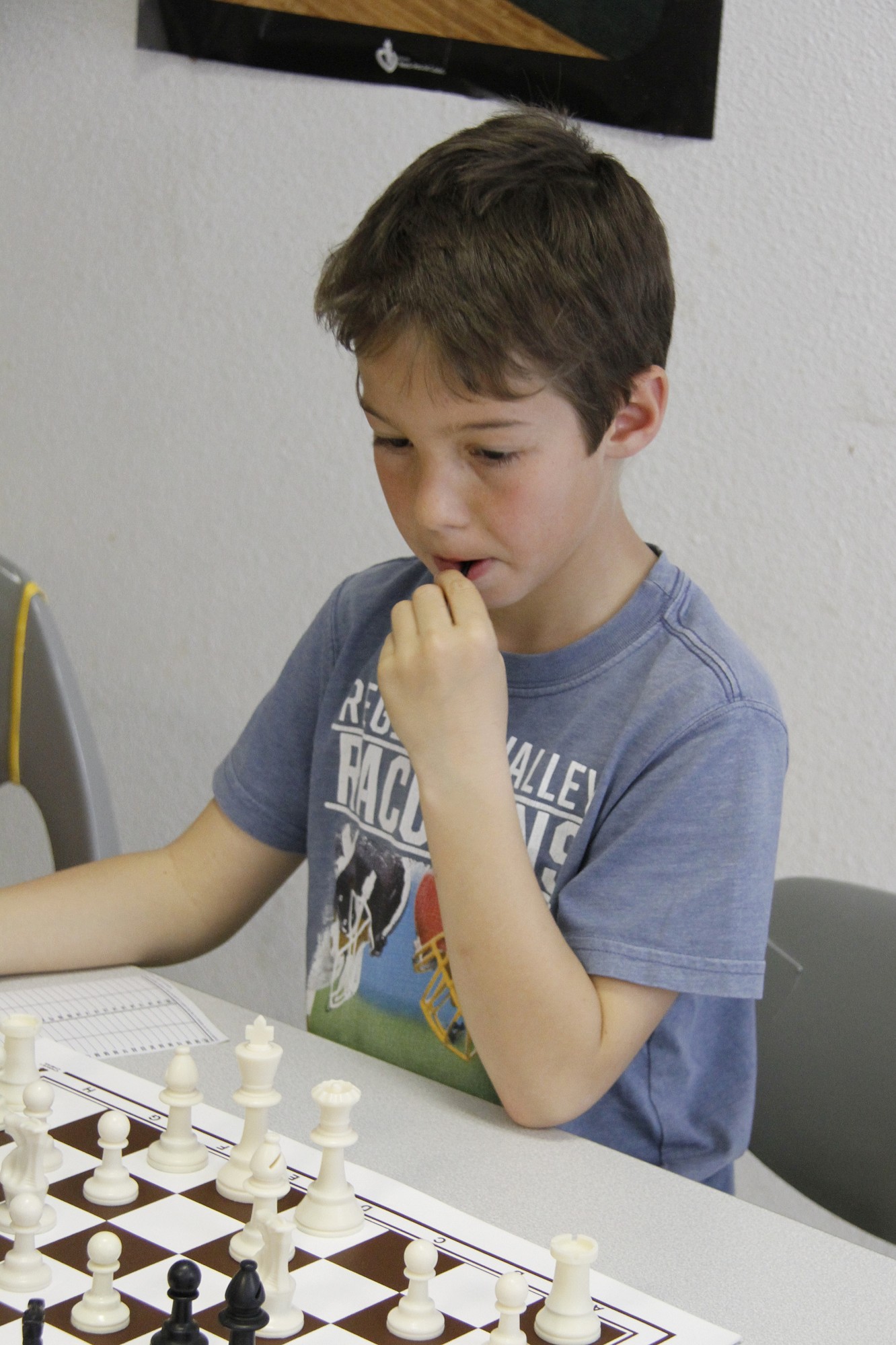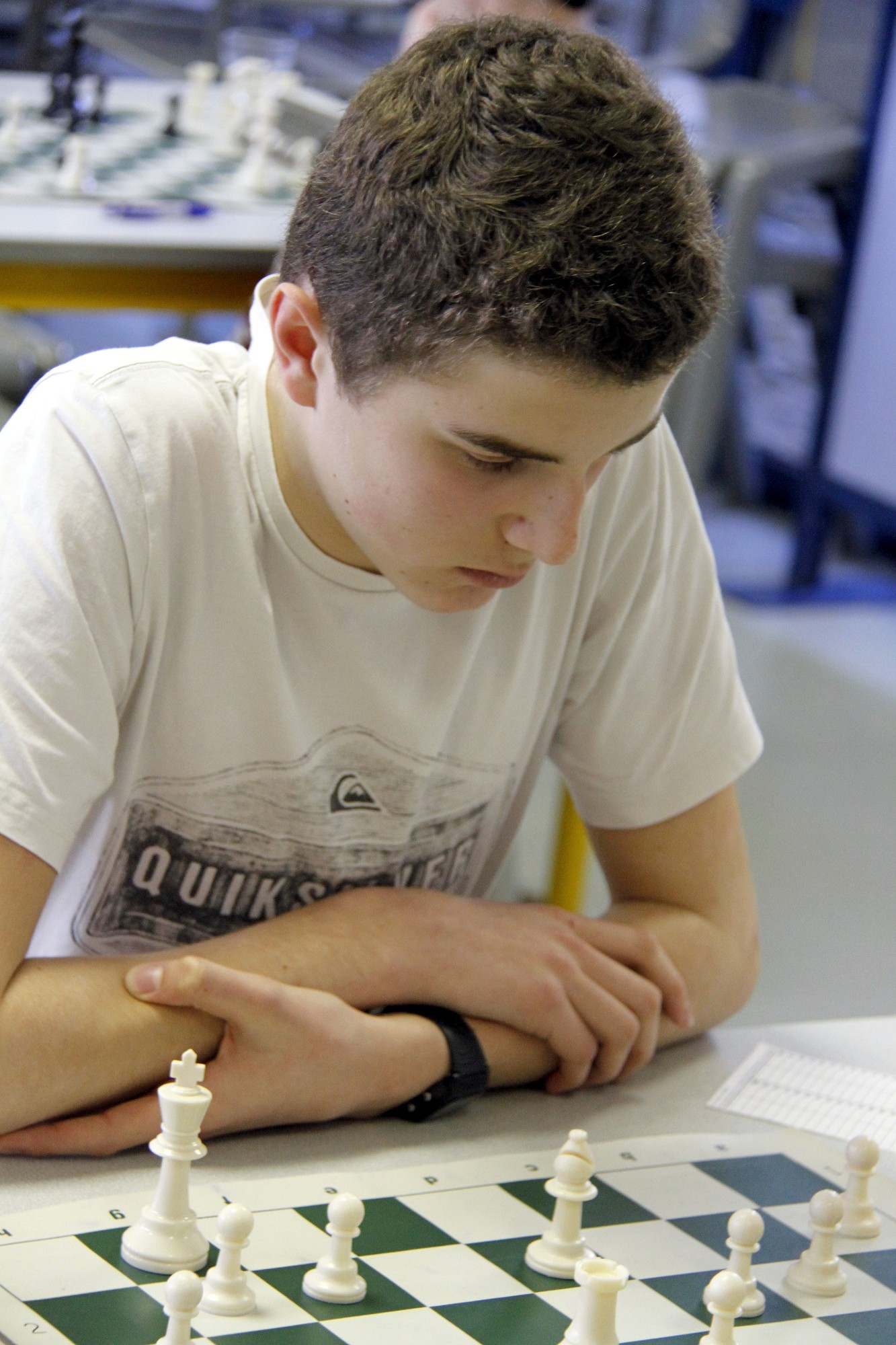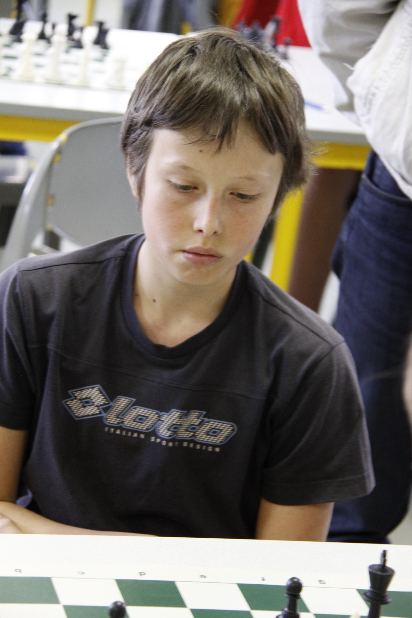 Alexandre, dans une position un peu délicate (avec un pion de moins et une menace de mat) mais pas forcément perdante, abandonne face à Aline Spano (1110N).