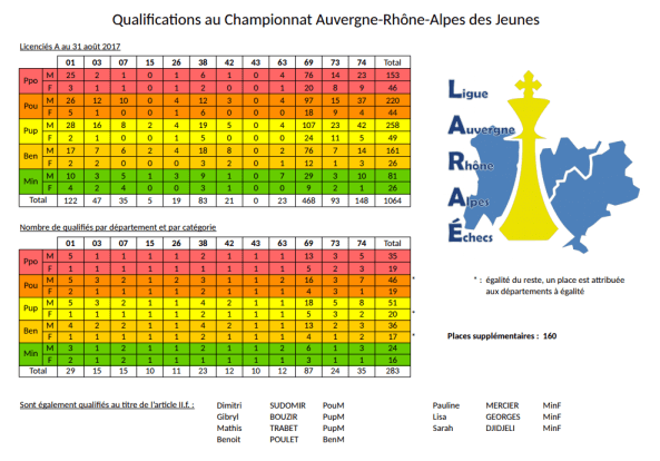 La federation attribue aux trois zones interdepartementales de la ligue (Auvergne, Dauphine-Savoie, Lyonnais) un nombre de qualifies par categorie pour le championnat de France Jeunes. Ces quotas seront publies en annexe de ce reglement avant la fin de la 1re ronde. Pour le besoin des qualifications, un