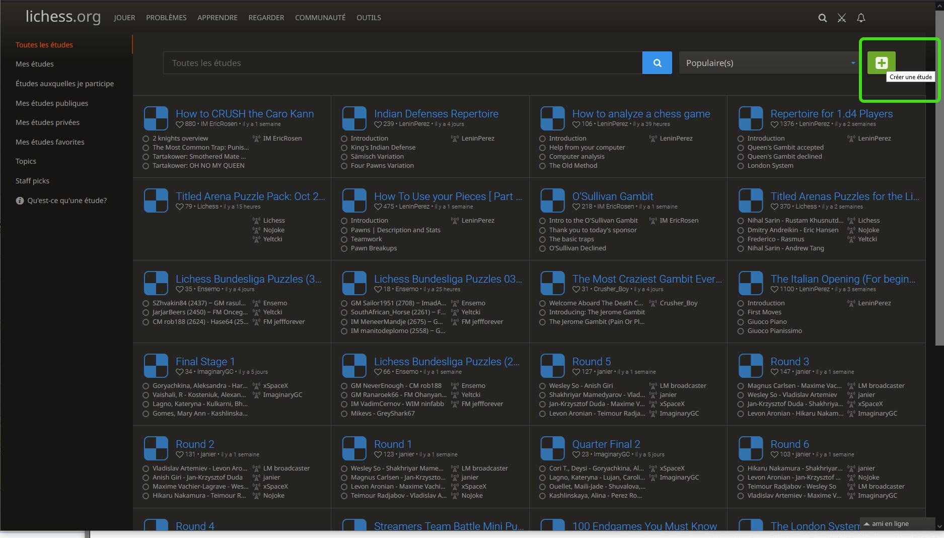 Notre but étant de créer une étude de partie, Cliquez sur le + en haut à droite « créer une étude