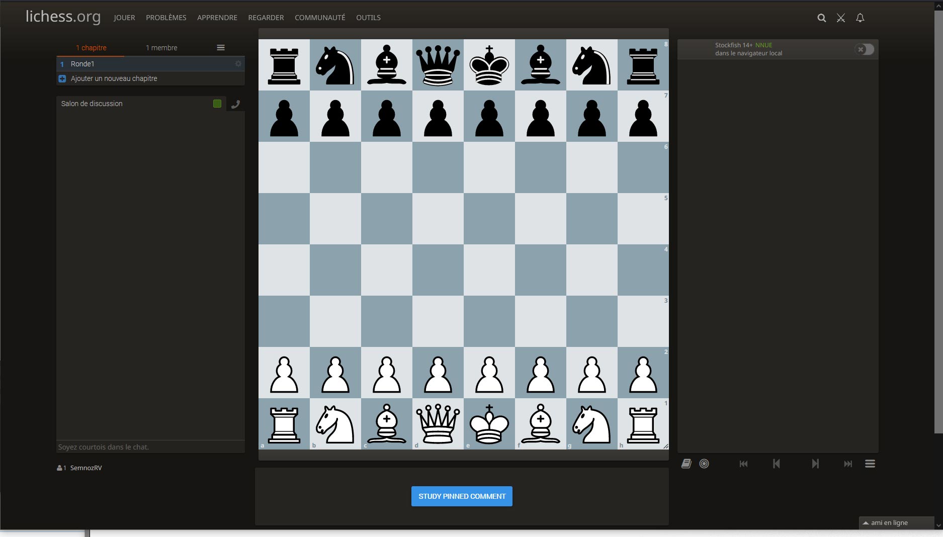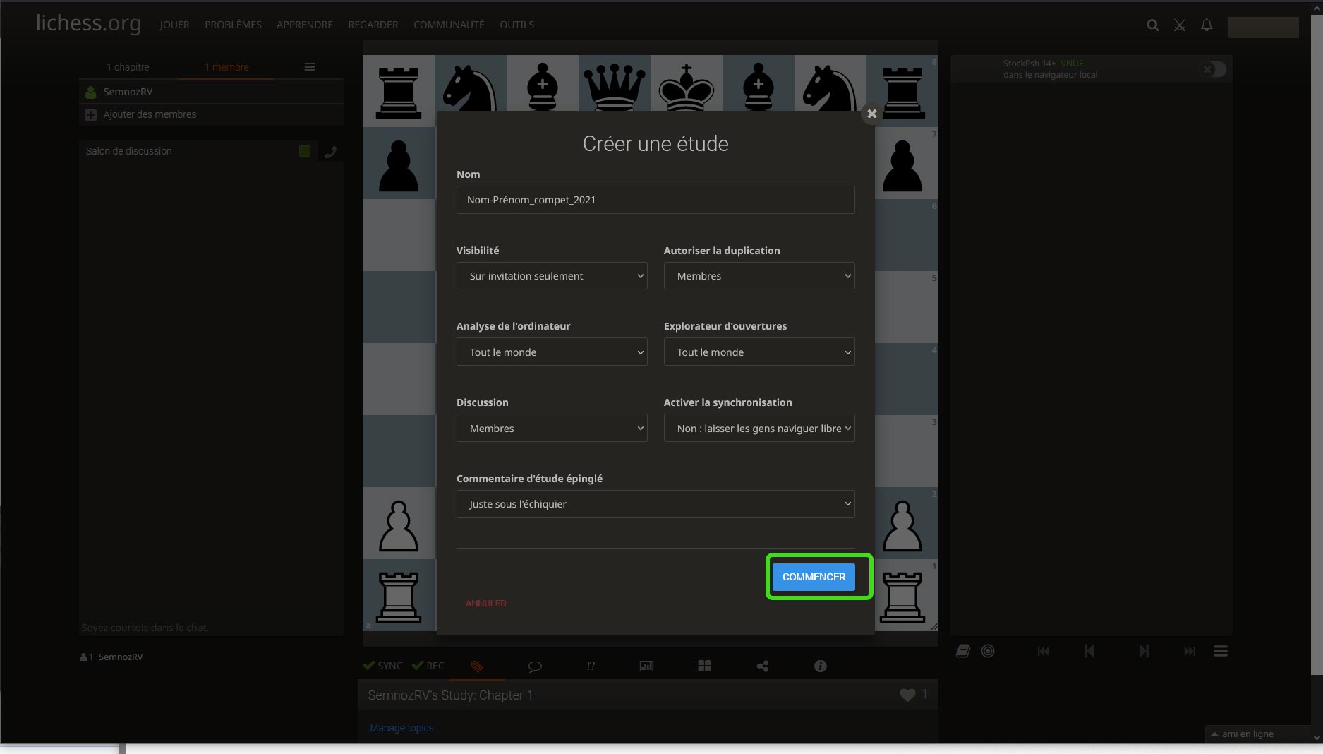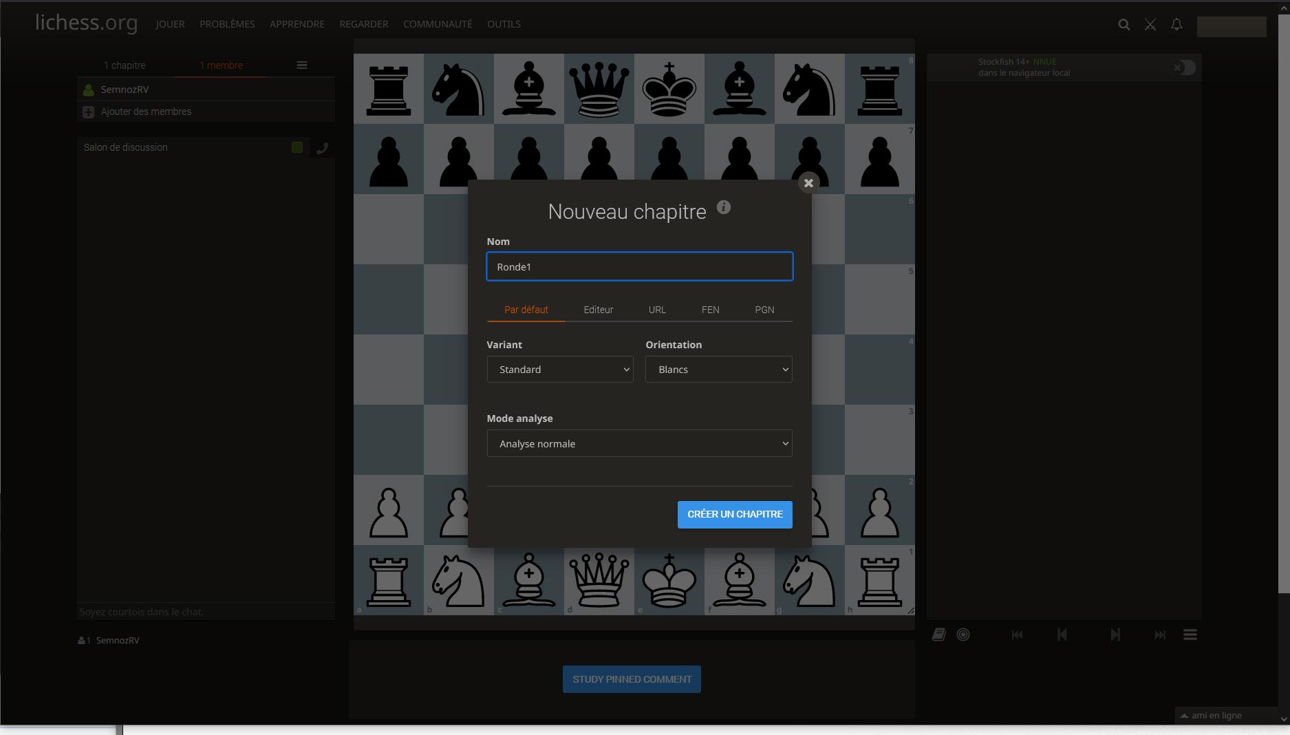 Vous pouvez paramétrer plusieurs choses comme la visibilité de votre partie. En mettant « sur invitation seulement« vous pouvez la montrer à votre entraineur et seulement à lui. N’oubliez pas dans la case discussion, de mettre au minimum « membres« . Puis cliquez sur » COMMENCER ». Vous allez pouvoir créer un nouveau chapitre. Par exemple, vous créez une étude relative à une compétiton et comme chapitre, vous allez pouvoir créer un chapitre par ronde.