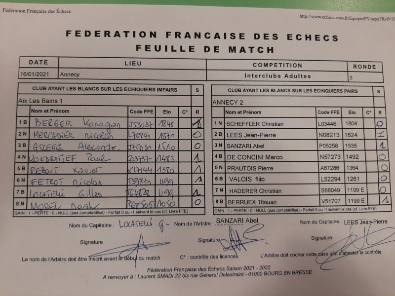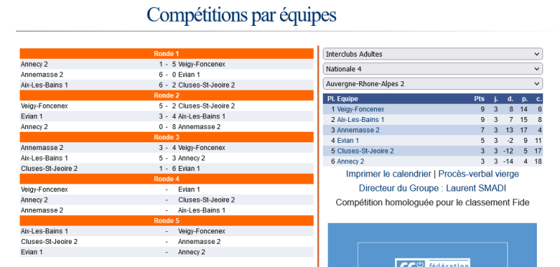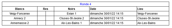Prochaine ronde le 30 Janvier. Nous recevons Annemasse 2 à domicile mais en extérieur. Annemasse à les blancs au premier échiquier. Match compliqué et décisif en perspective, Annemasse nous talonne.