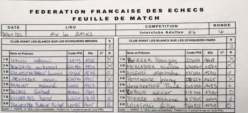 Comme il y a 15 jours, le club d’Aix les bains est organisateur mais Le club d’Annemasse joue avec les blancs sur les échiquiers impairs. Le capitaine d’équipe est Gilles Locatelli et Xavier Reboud notre arbitre.