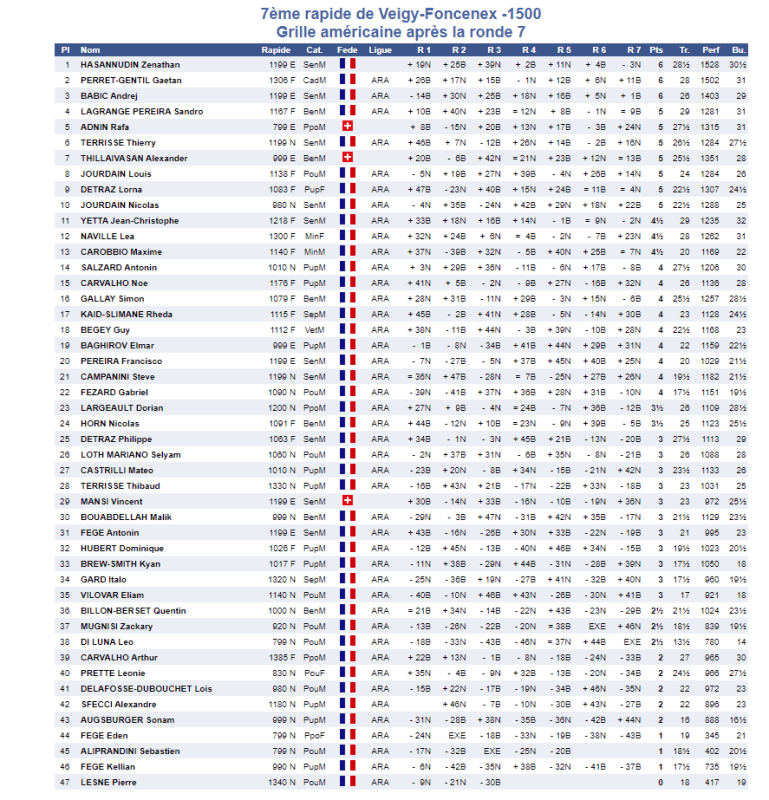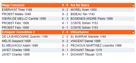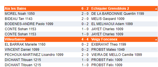 Dimanche. Deux endroits à suivre: Tournoi de parties rapides à Veigy (74) avec 3 Aixois: Léonie Prette, Loïs Delafosse-Dubouchet et Dorian Largeault. Dorian tire son épingle du jeu et fini dans la première moitié du tableau. Léonie et Loïs terminent avec 2pts / 7.