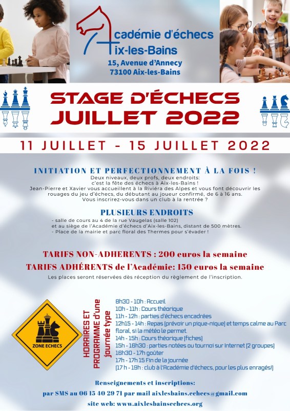 DEVENIR UN BON JOUEUR D’ECHECS DE CLUB EN UNE SEMAINE ? La découverte d’une discipline à la fois sportive, ludique et culturelle peut changer la vie de vos ados. Les trois intervenants, Jean-Pierre Mercier, Xavier Reboud et Olivier Godard accueilleront les étudiants de 7 à 16 ans selon leur niveau et sur deux sites, dont le siège du club d’échecs, parfaitement équipé. C’est aussi l’occasion de découvrir la ville et son magnifique Parc Floral, qui a connu 4 championnats de France d’échecs dans son histoire.