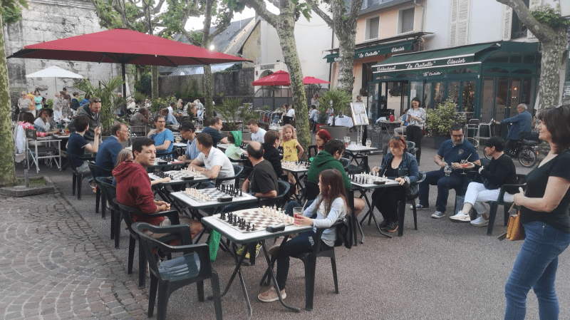 Après 3 tournois-tests avec des tarifs spéciaux pour la restauration des joueurs d’échecs (chuut, c’est un secret), la saison est lancée et perdurera tout l’été. Des poules de 9 joueurs (un principal, un amateur, un débutant si besoin est) se terminent à 21h30 pour laisser le quartier libre au « banquet gaulois » ou à d’autres blitz.