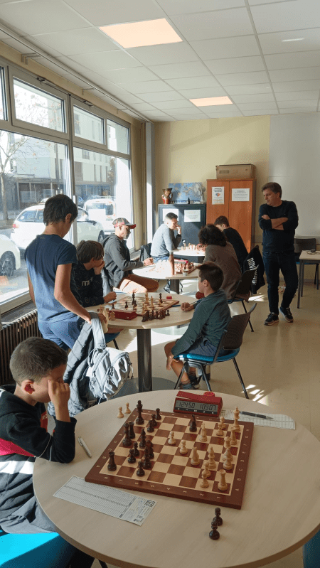Au premier échiquier, Hugo a longtemps donné l’impression de mener le débat. Mais avec peu de temps à la pendule comme à l’accoutumée, l’expérience de notre arbitre départemental Romain Billotti s’est imposée dans la transition en fin de partie. Les 20 minutes d’avance d’Hugo n’y pourront rien.