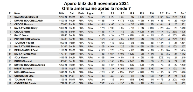 Pierre Croce, le papa de Thomas, est super-entraîné par le tournoi stage de La Bresse auquel il a participé, et cela se voit par sa très belle 5e place. Le lycéen Oscar Raud accomplit un parcours étonnant et déclare qu’il va se remettre sérieusement aux échecs. Valentin Porcheron est égal à lui-même d’après lui-même: « je fais toujours ce résultat-là « . Youcef vient d’arriver au club et a encore ses valises à la main. Le pupille s’adapte très vite et aspire à gagner d’autres galons dans les prochaines semaines. On murmure qu’un grand frère, féru de chess.com, l’entraîne secrètement. Hervé Joly, notre secrétaire général si discret, rate l’exploit d’un point. Il faudra qu’il revienne …