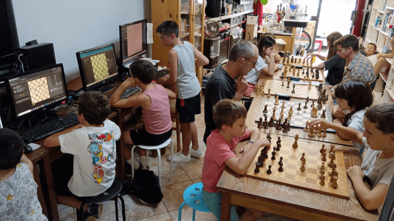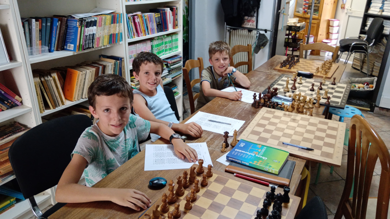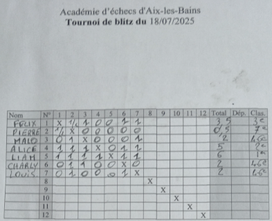 Le dernier jour du premier stage, le vendredi 18 juillet 2025, les participants ont disputé leur premier tournoi de blitz. Le résultat a consacré les plus assidus, la fratrie Colautti, qui s’adjuge les deux premières places. Mais on a bien ri: synchroniser ses coups avec le bouton de la pendule d’échecs, c’est rigolo !