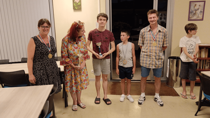 Le podium: 1er prix féminin (avec la Coupe) Isabelle, 2e Anne-Claire Delatteignant. Hugo réalise 100% des points et s’arroge le maillot jaune. Les Croce sont toujours là, fils et père sur la 2e et 3e marche du podium. Thomas et Pierre, les véritables locomotives du club, sont vraiment remarquables !