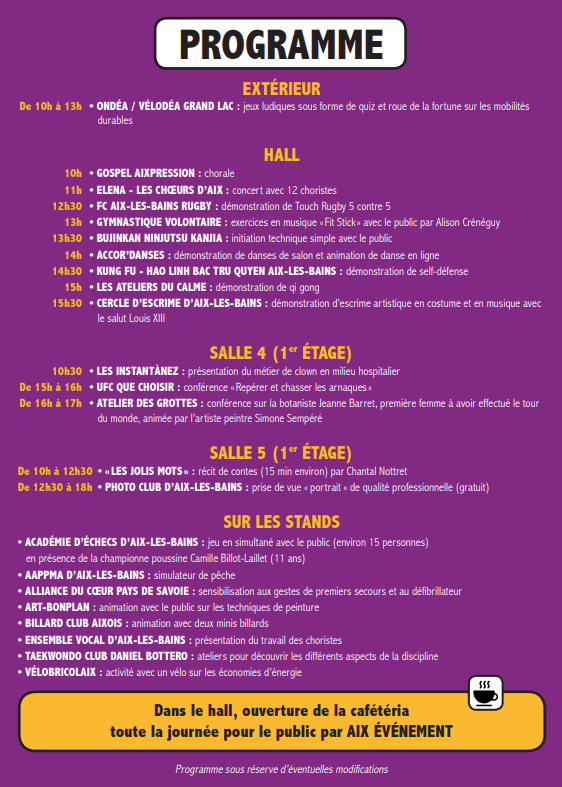 La ville d’Aix-les-Bains accueille ce dimanche 7 septembre 2025 son forum des associations au Centre Culturel et des Congrès 3C, Rue Jean Monard à Aix-les-Bains (en bordure du Parc des Verdures).