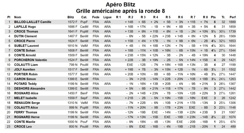 Camille est là, mais on se demande si elle va tenir le coup devant une opposition aussi renforcée. Peut-être est-ce le plus fort blitz de l’année passée ? Laurent Sublet, un vétéran très fort en théorie et classé 1810 est parmi eux. Le surdoué Thomas Croce, concurrent de Camille, est dans les startings blocs, tout comme Hugo Lapille, qui vient de passer son bac à 15 ans. Le benjamin Sohan Conte est là aussi, capable du meilleur lorsqu’il est en forme. Et les outsiders comme Pierre Croce, Arnold Conte ou Aurélien Joly sont à l’affût de la moindre faiblesse. Nos deux « Alice » sont présentes également et lorgnent vers la coupe féminine, même si Isabelle part favorite. Il y a de l’ambition chez ces Alice-là. (…)