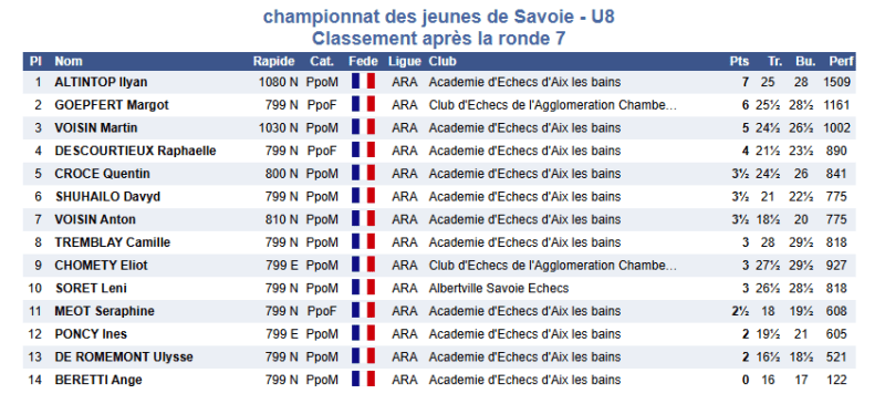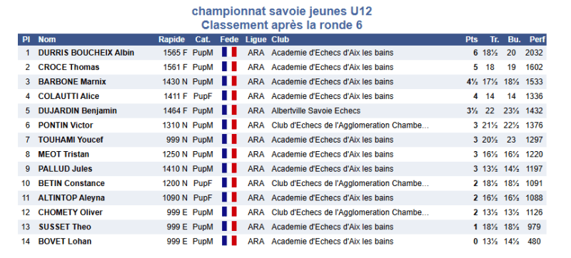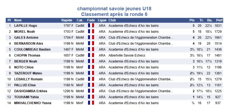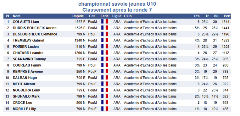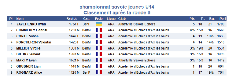 Iryna Savchenko d’Albertville est championne de Savoie U14 féminine (suivant son choix de qualification pour les championnats de région, elle pouvait naturellement prendre le titre mixte et se qualifier en mixte). Gabriel Commerly d’Aix-les-Bains est champion de Savoie U14 mixte.