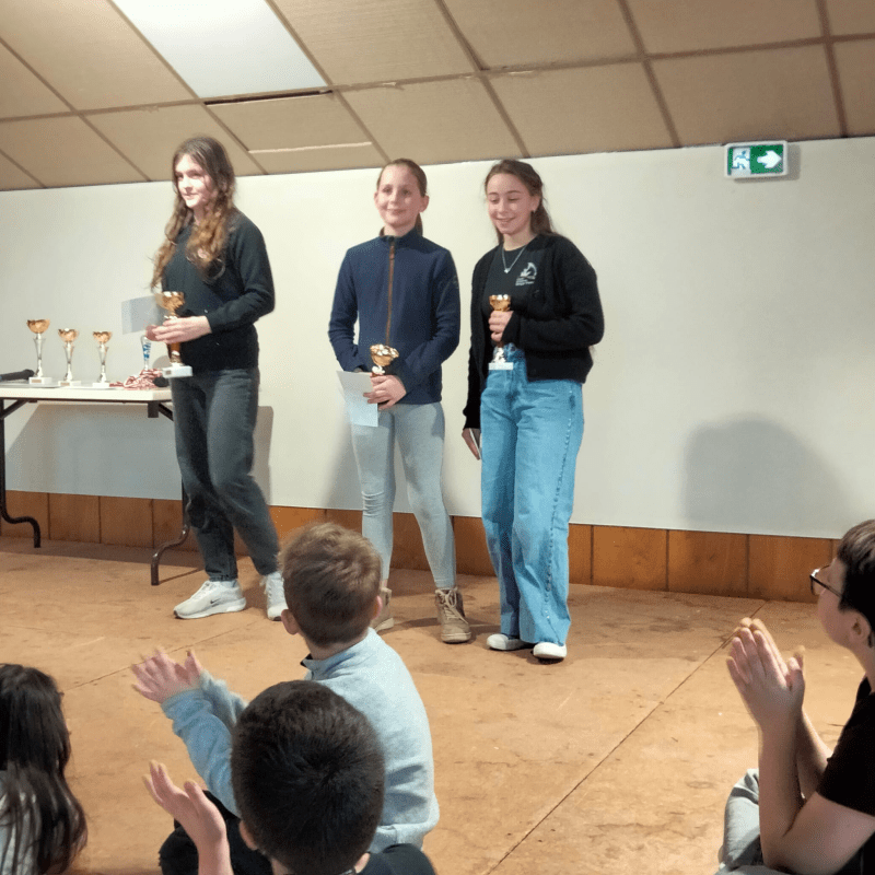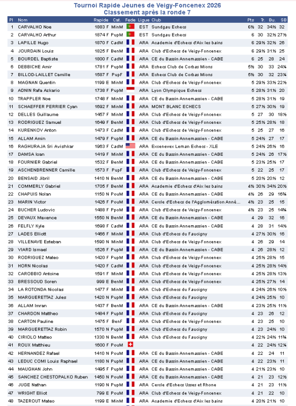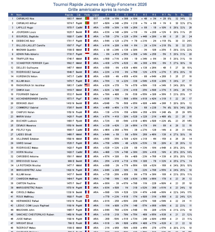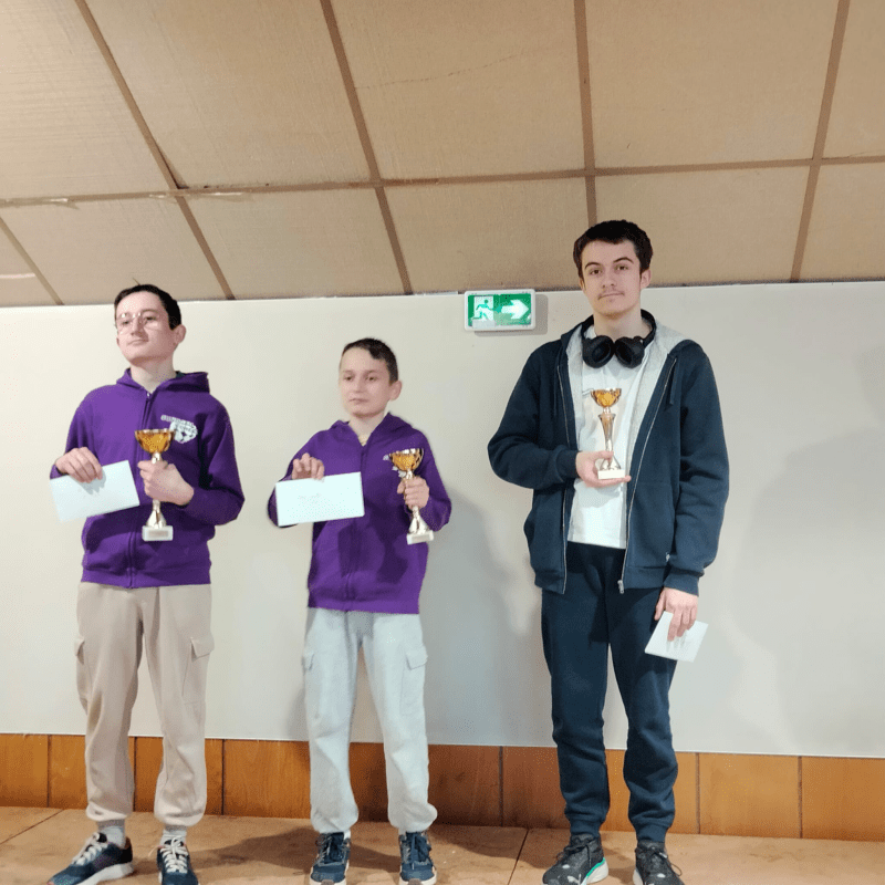 7e et dernière ronde : Pas de chance pour cette ultime rencontre : Camille est opposée à Gabriel et l’emporte. Hugo gagne encore et se retrouve sur le podium avec 6 sur 7. Mateo termine très fort avec 4 pts sur 7 et le voici 48e au général.